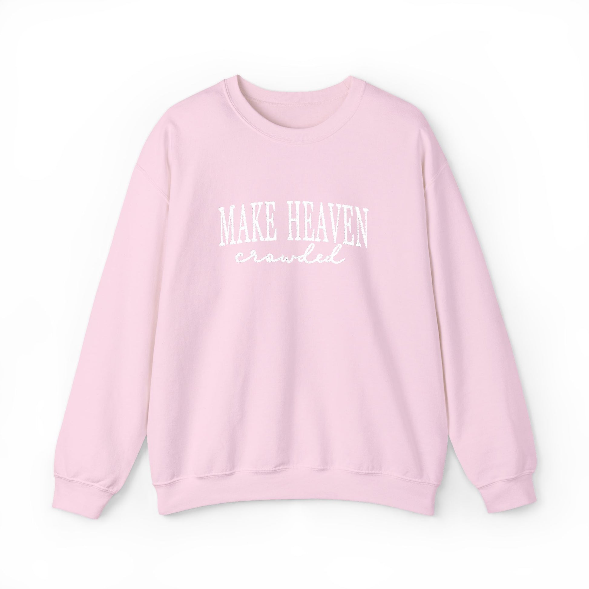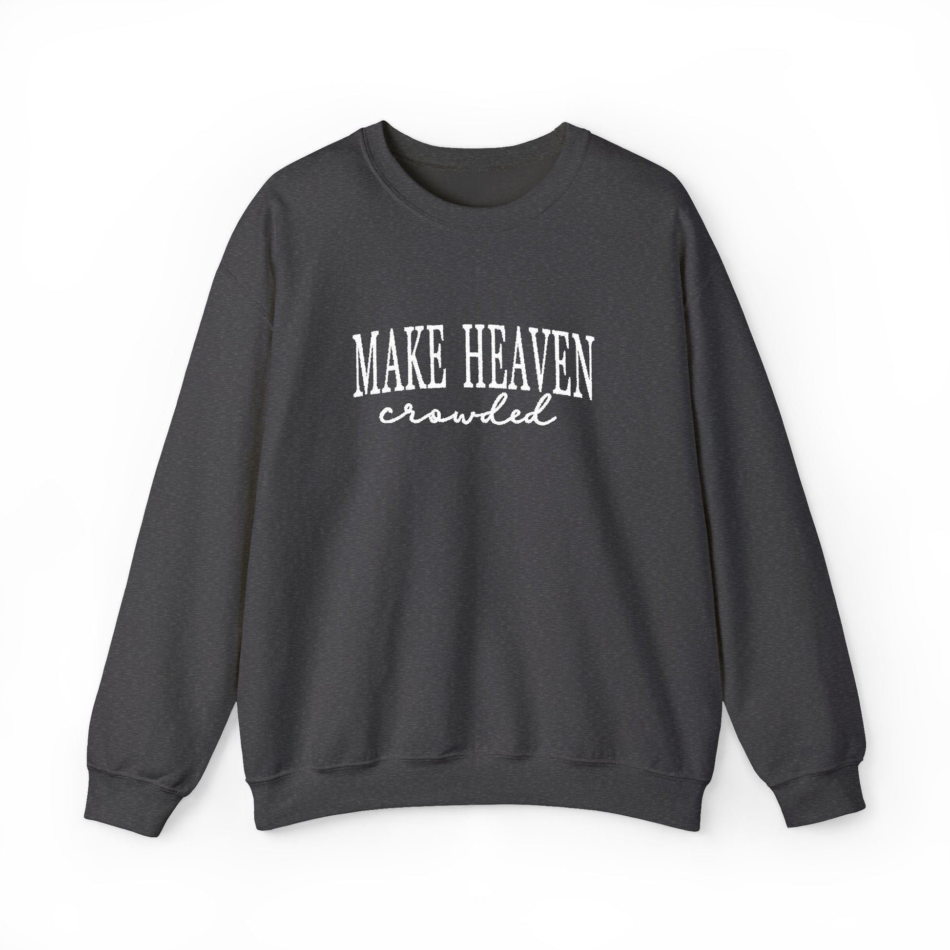 Wrap yourself in cozy truth with our “Make Heaven Crowded” crewneck. 🤍 This sweatshirt is made on the Gildan 18000 Heavy Blend, a classic unisex fit that’s soft on the inside, smooth on the outside, and built to last. The 50/50 cotton-poly blend gives you that warm, comfy feel without feeling bulky—perfect for church days, errands, or slow mornings at home. Details you’ll love: Medium-heavy 8.0 oz fabric for cozy warmth Soft, durable 50/50 cotton-poly blend Ribbed collar + reinforced cuffs/hem to help it keep its shape Double-needle stitching for long-lasting wear Smooth surface for crisp prints (and embroidery options, too!) Tear-away label for extra comfort Made with ethically grown U.S. cotton + OEKO-TEX certified dyes
